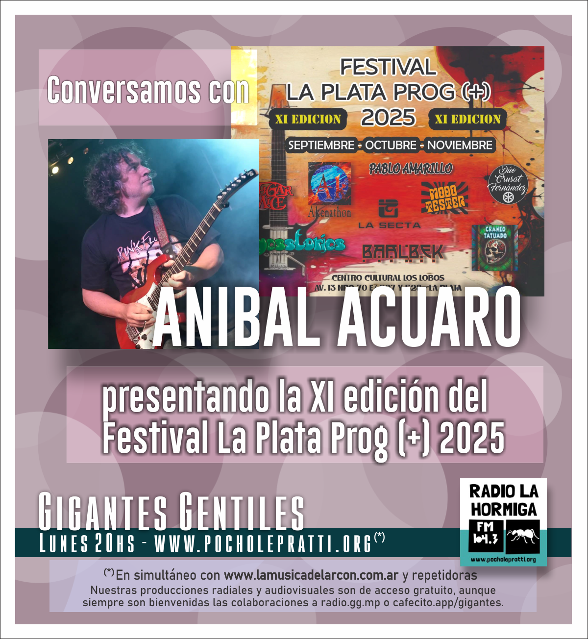 En este programa, una charla vía telefónica con Aníbal Acuaro, presentando la grilla del Festival La Plata Prog (+) 2025 y la música de Pablo Amarillo y Akenathon. Además, lo nuevo de Tomás Batista, un nuevo recorrido por la obra de Alejandro Miniaci dedicada al Arq. Salamone, y el cierre con un homenaje a Gustavo Cerati en del día de su cumpleaños.