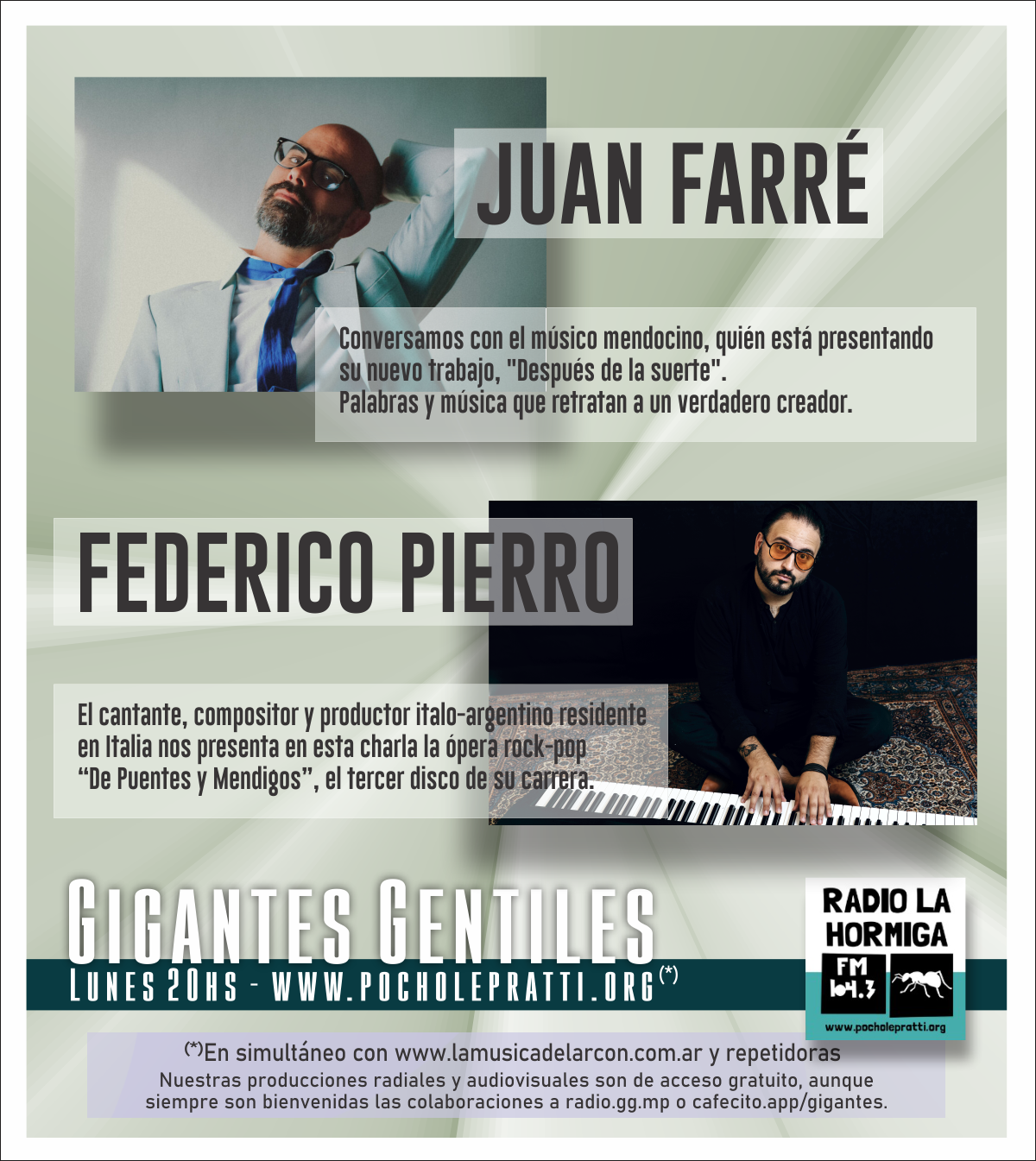 Esta noche, dos entrevistas: Juan Farre nos presenta su nuevo trabajo, «Después de la suerte», y Federico Pierro nos trae «De puentes y mendigos», su opera rock-pop. Además, un anticipo de la nueva publicación de Gary Husband, una recopilación de versiones y demos registrados entre 1978 y 2021. Y el cierre con Fughu, luego de su presentación en Rosario y días antes de su participación en el Festival La Plata Prog (+).