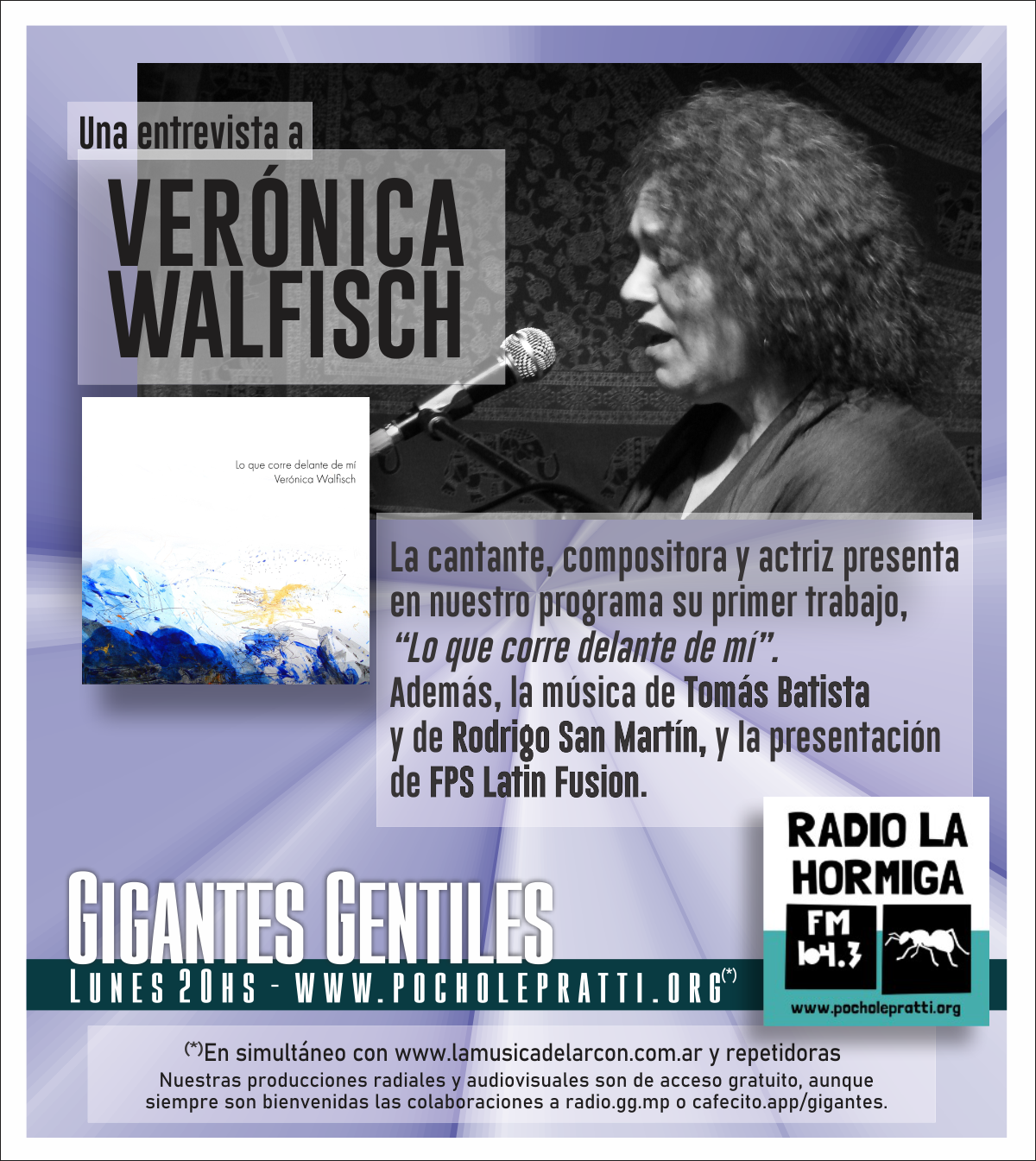 En esta emisión, una entrevista a la compositora, cantante y actriz Verónica Walfisch presentando su primer trabajo, «Lo que corre delante de mí». Además, la música de Tomás Batista, Rodrigo San Martín en la previa de su presentación en el Festival La Plata Prog (+) 2025 y el reciente excepcional trabajo de FPS Latin Fusion en el que intervienen Jota Morelli, Luis Fuster, Sergio Santi, Palmo Addario y Pulga Luciani.