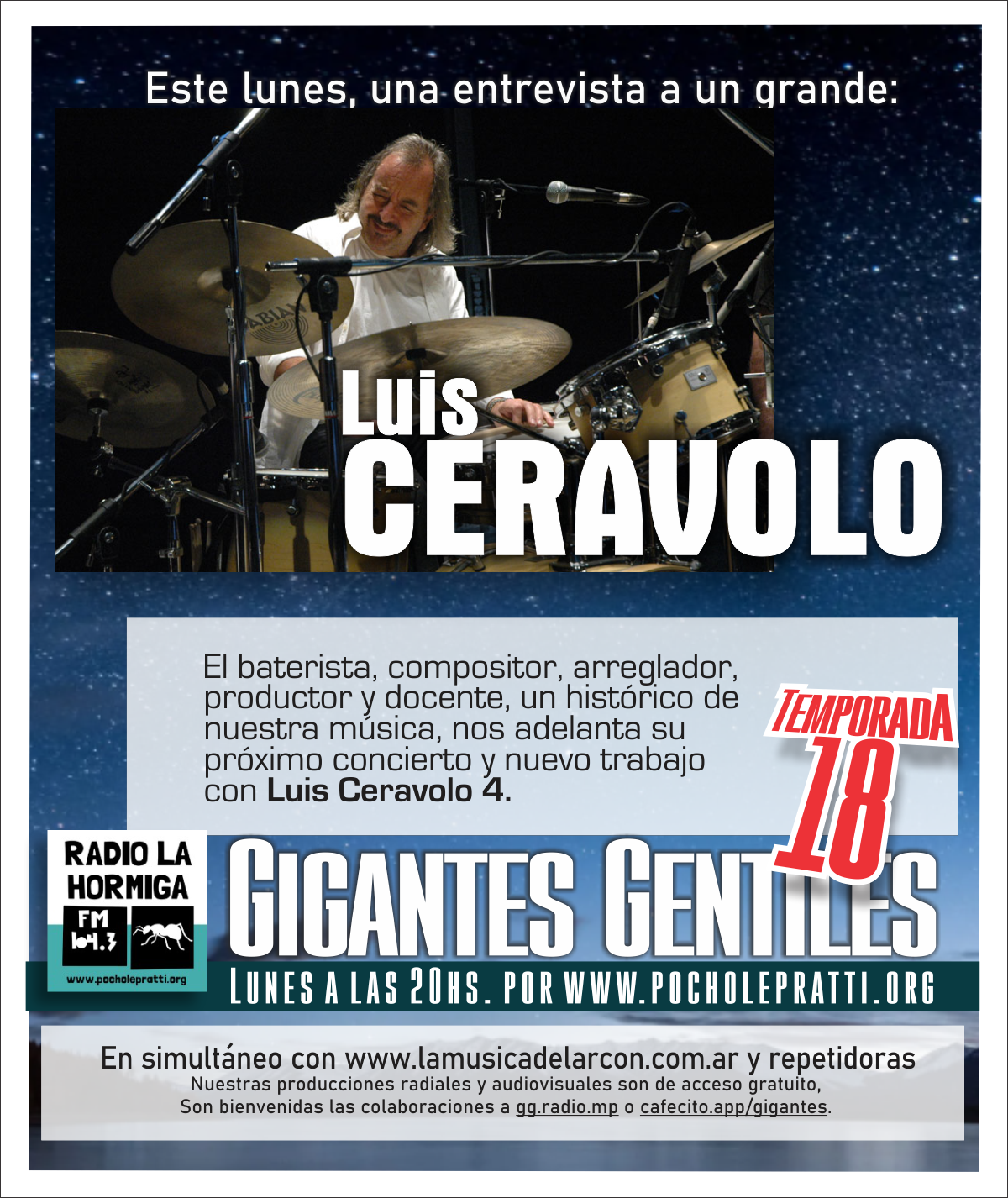 En este programa, una entrevista al baterista, compositor, arreglador y productor Luis Ceravolo, quien nos presenta su nuevo proyecto “Luis Ceravolo 4”, su formación de cuarteto. Con una trayectoria que lo llevó a tocar en los principales escenarios de Buenos Aires, Barcelona, Madrid y Suiza, Ceravolo es una figura clave en la fusión del tango y el folklore latinoamericano con el lenguaje abierto del jazz. En esta extensa y muy cálida charla, Luis nos cuenta sobre su presente y futuro, sin dejar de repasar su rica trayectoria junto a Astor Piazzolla, Luis Alberto Spinetta y otros grandes de la música popular. Y la versión de la apertura, esta vez a cargo de Diego Souto.